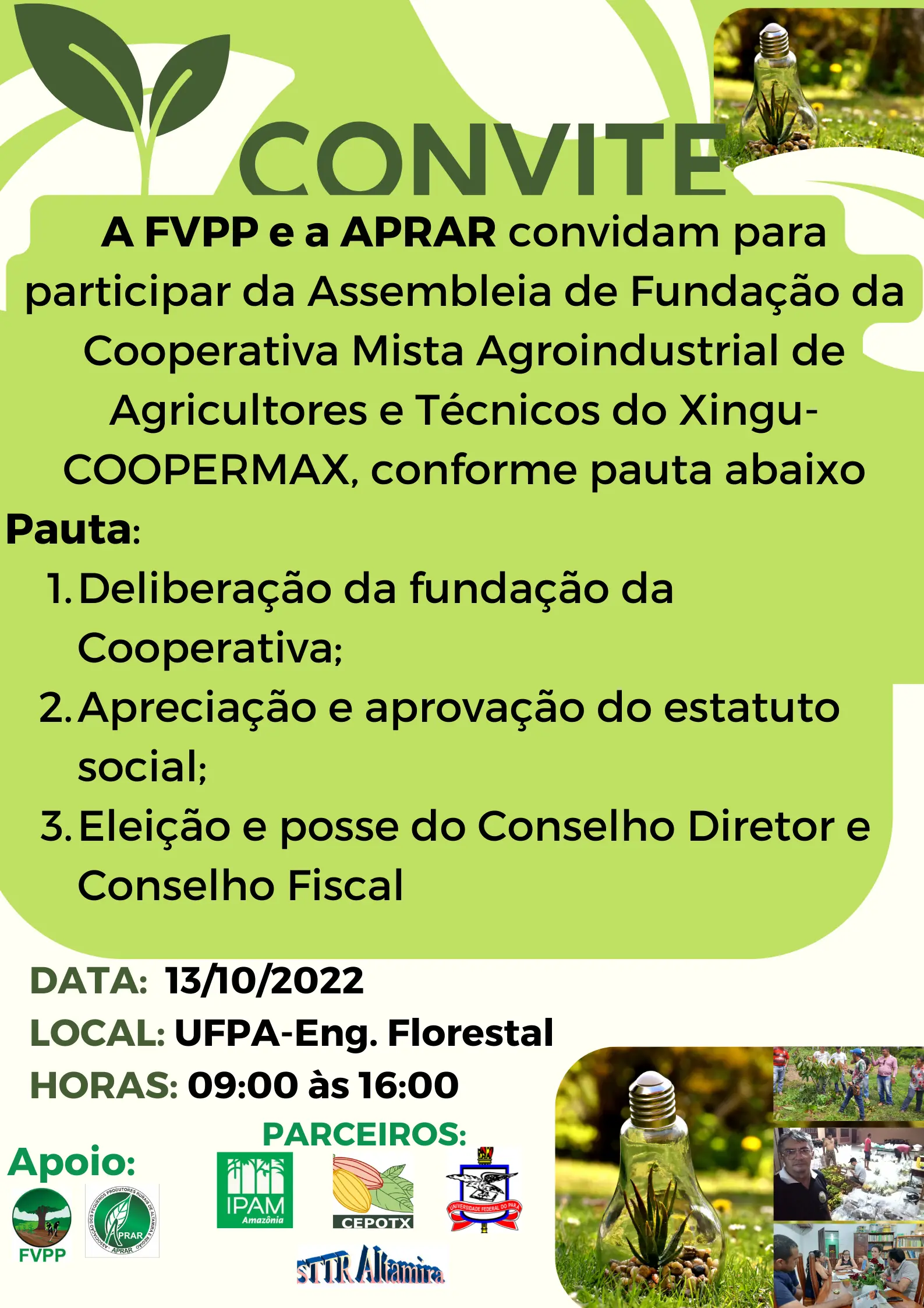A FVPP e a APRAR convidam para participar da Assembleia de Fundação da Cooperativa Mista Agroindustrial de Agricultores e Técnicos do Xingu-COOPERMAX, conforme pauta abaixo
