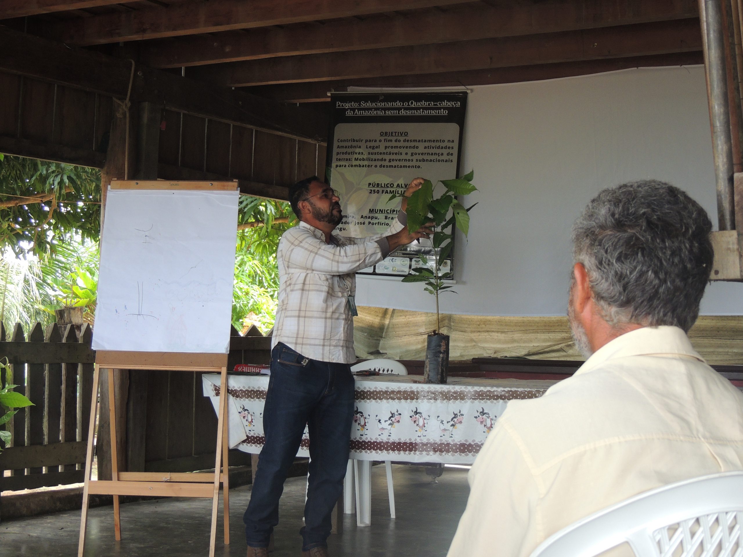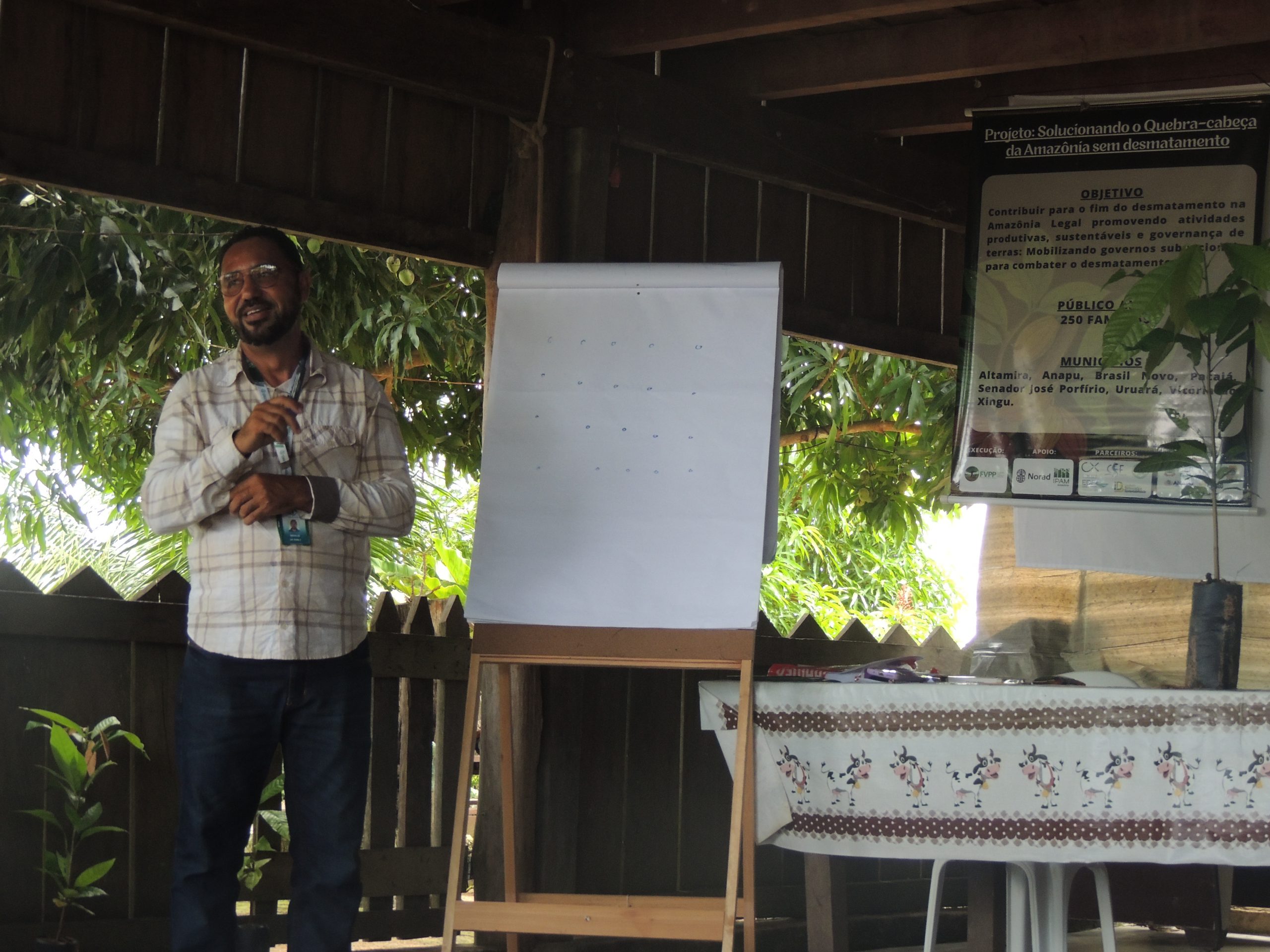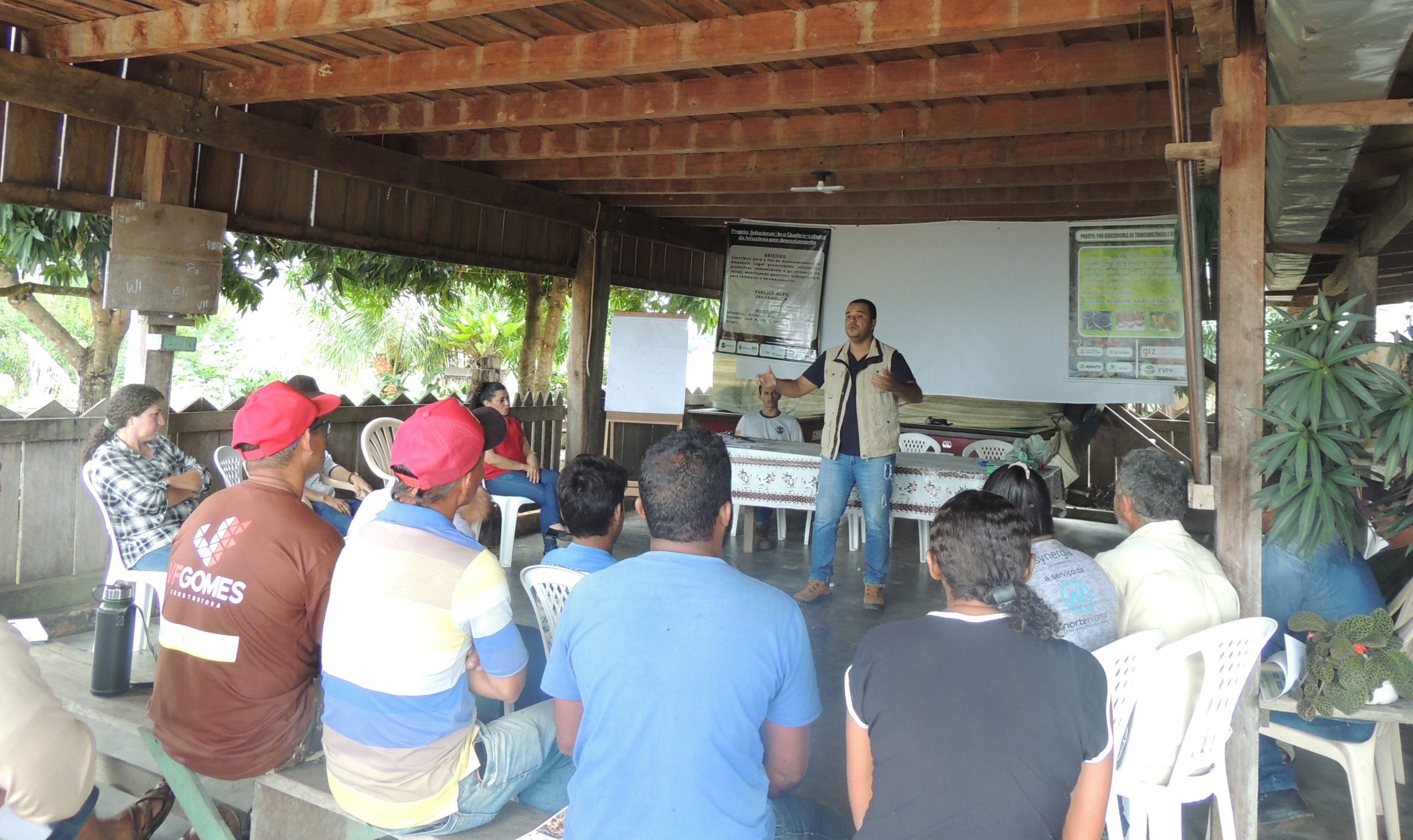Em seguida, iniciou a palestra intitulada de Cacau na Mata-Teoria, que foi ministrada por Sidevaldo Santada de Jesus, técnico da EMATER-Medicilândia, no qual abordou sobre os modos de produção do cacau, manejo sustentável, enxertia e poda. Durante a tarde ocorreu a aplicação da teoria com a prática de poda com os agricultores da comunidade.